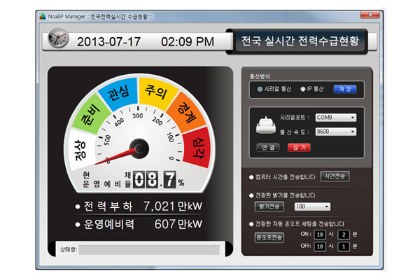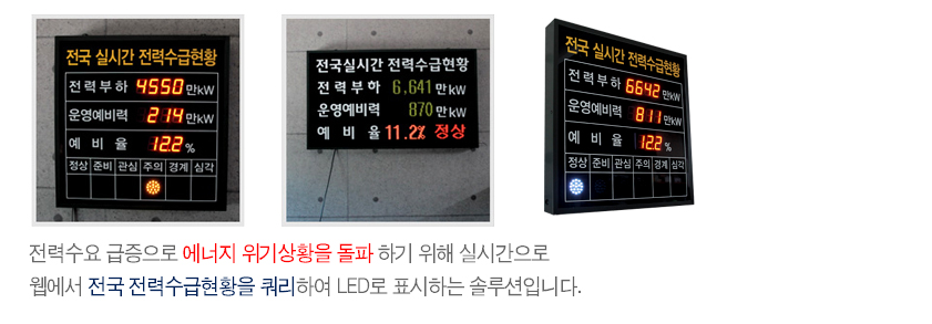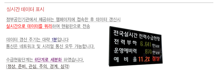 전국 관공서나 에너지 사용량이 많은 기업에서 하절기나 동절기 전력사용량으로 인한 단전시 미리 예방 차원에서 전국 전력사용량을 표시하여 경각심을 고취하고 에너지 절약에 다함께 동참하자는 취지의 제품입니다.