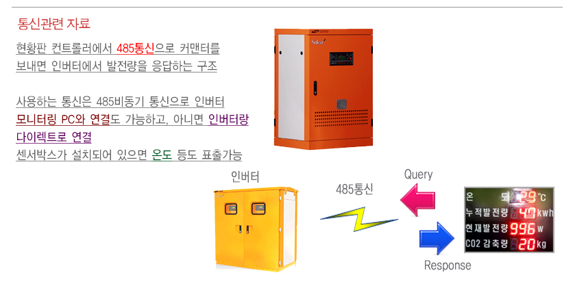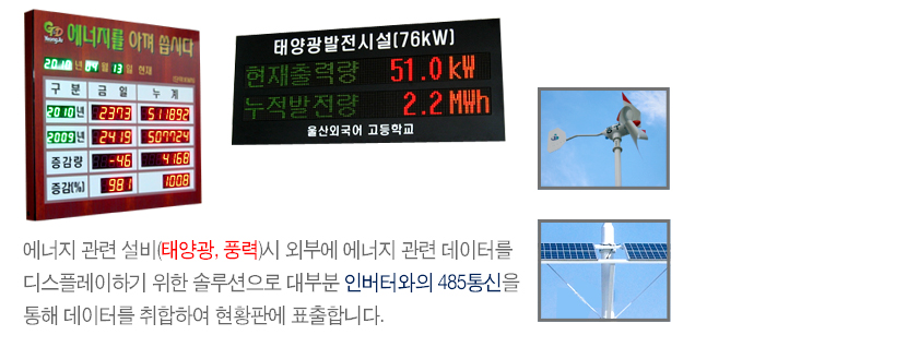 신재생 에너지와 관련하여 태양광이나 풍력을 많이 신축공사시에 설치하고 계십니다. 이러한 태양광이나 풍력의 인버터와 연결하여 별도의 외부 디스플레이 장치를 통신으로 인터페이스하여 LED로 표출하는 제품입니다.