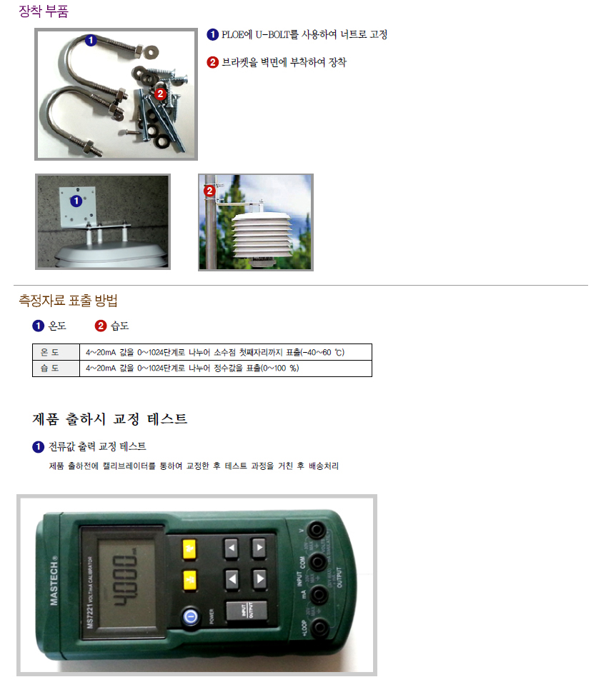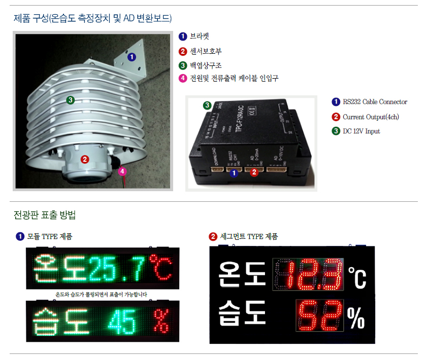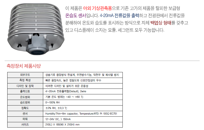 기존 온습도 센서가 대부분 센서위주로 되어 있어 옥외용에 사용하면 문제가 많이 되었습니다. 이 제품은 별도의 백엽상이 필요없이 자체 백엽상 형상을 갖추고 있고, 온습도 데이터를 전류값으로 출력하여 원거리에서도 모니터링이 가능합니다.